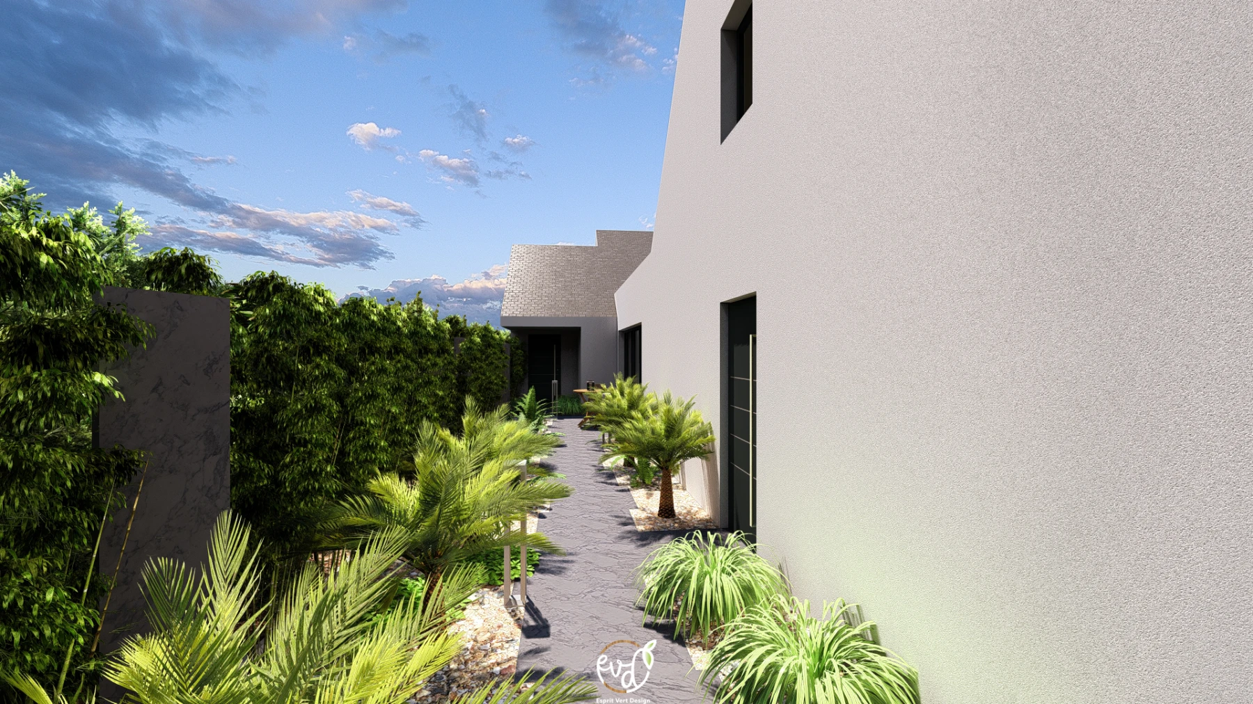 Afin de préserver l'intimité, nous avons conçu un brise-vue en palis d'ardoise et une séparation entre l’espace parking et la terrasse via un portillon, pour garantir à la fois sécurité et esthétique.