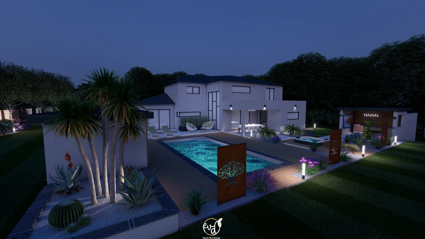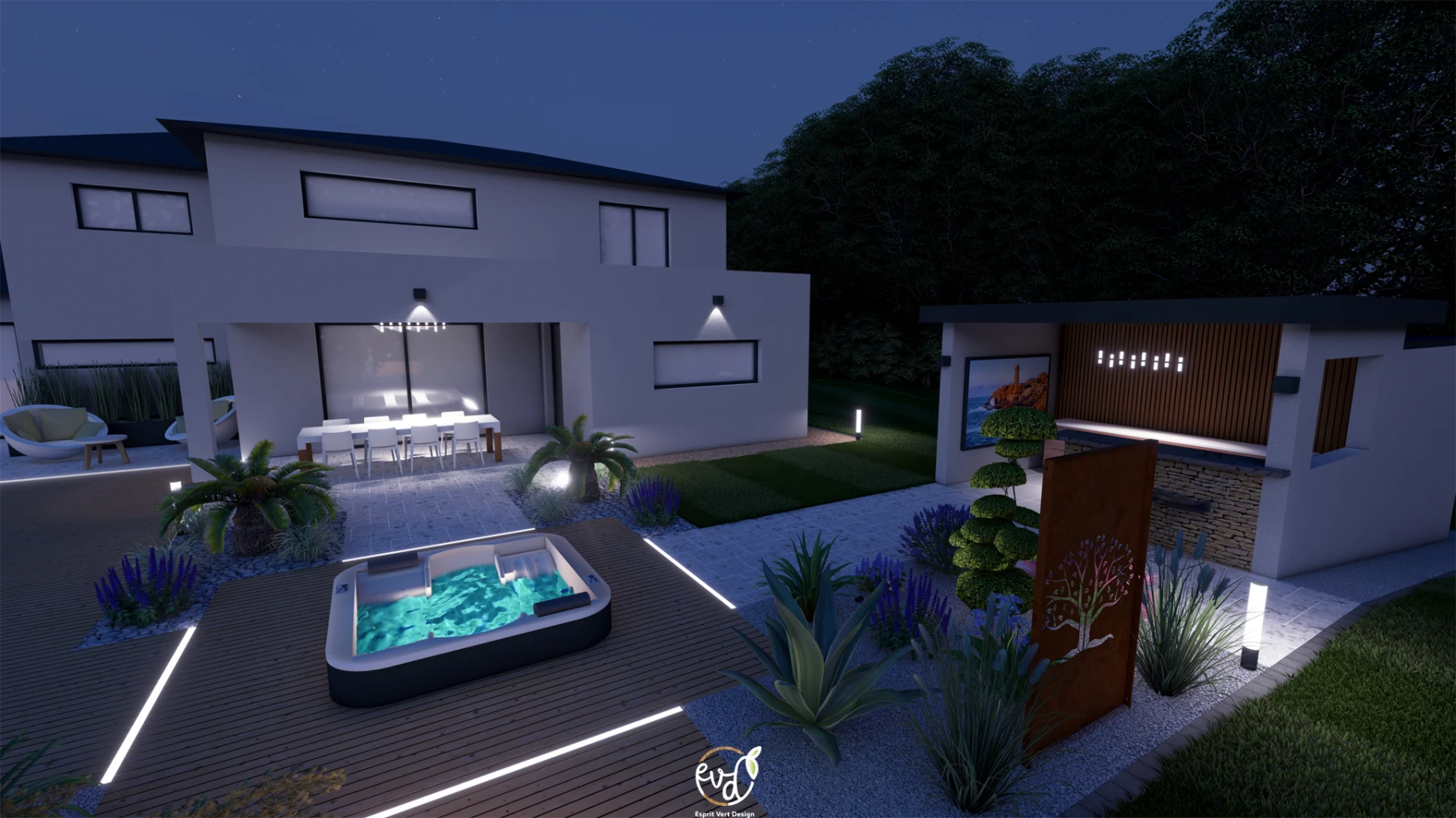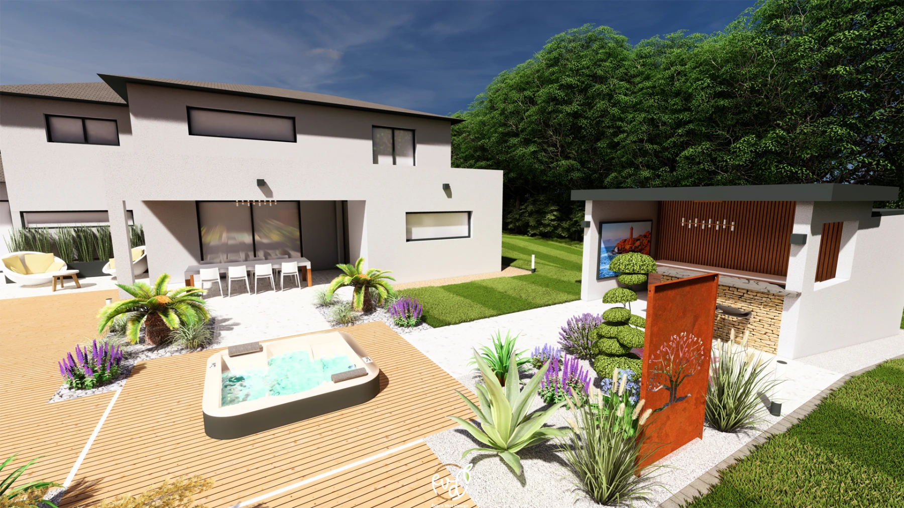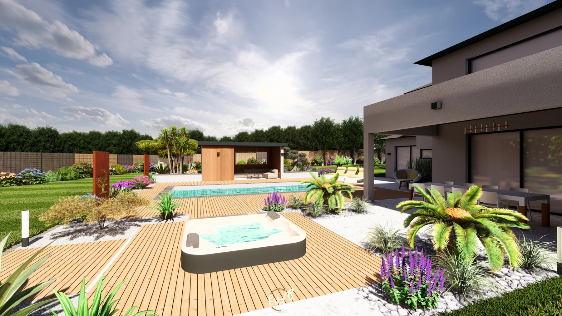 - Une grande terrasse en bois entourant la piscine et le spa, créant un espace de bien-être.