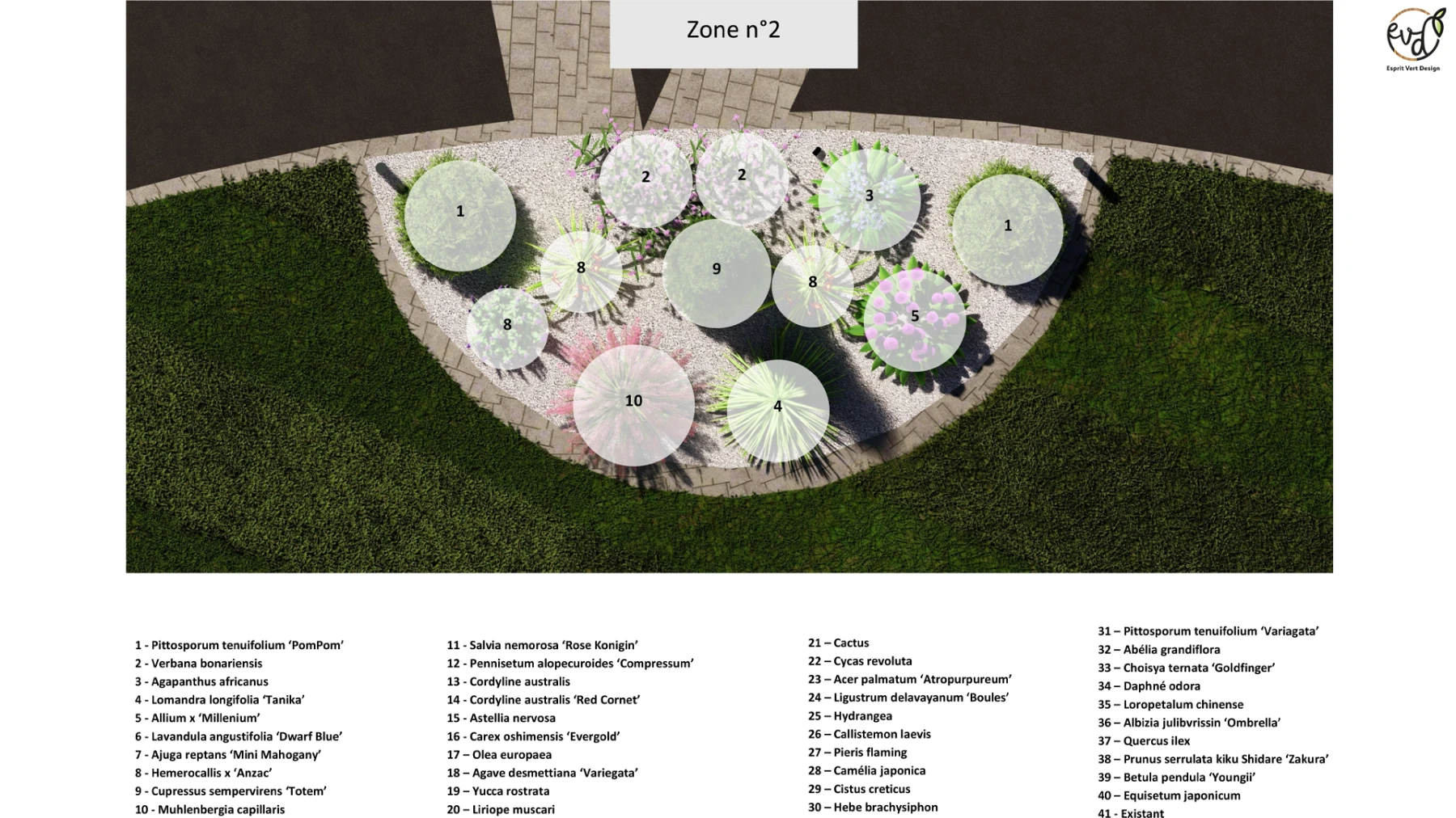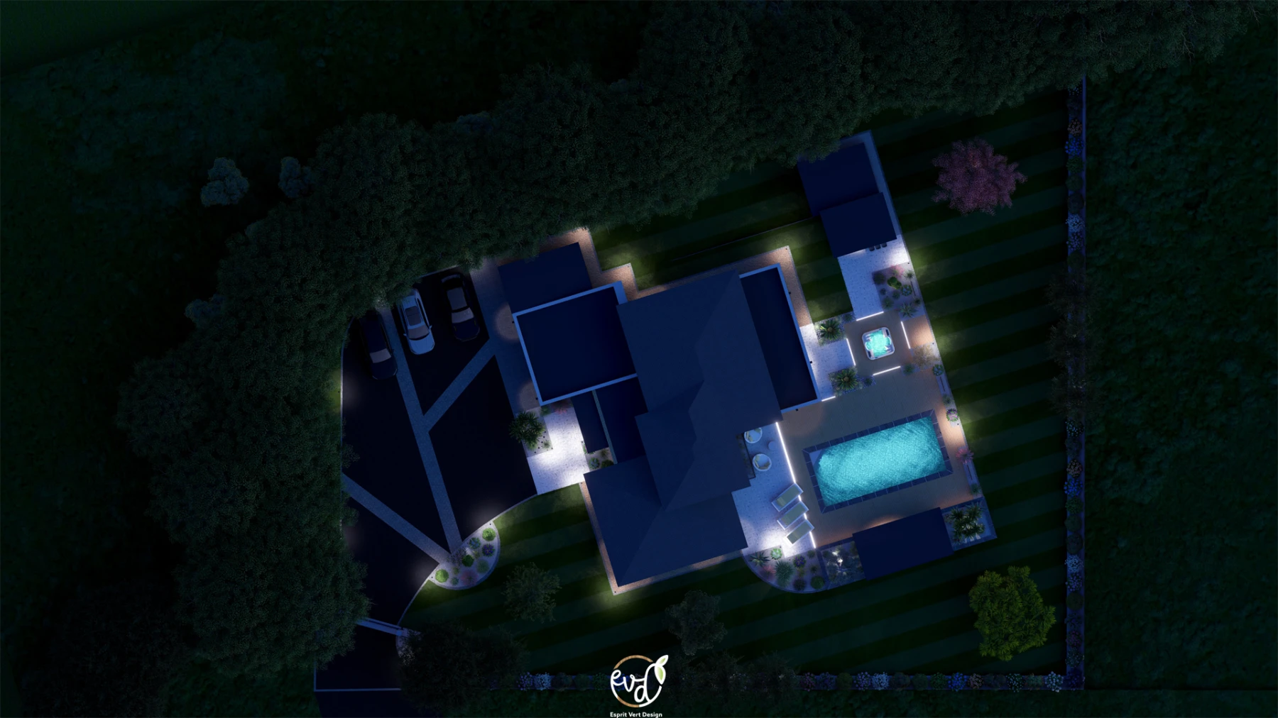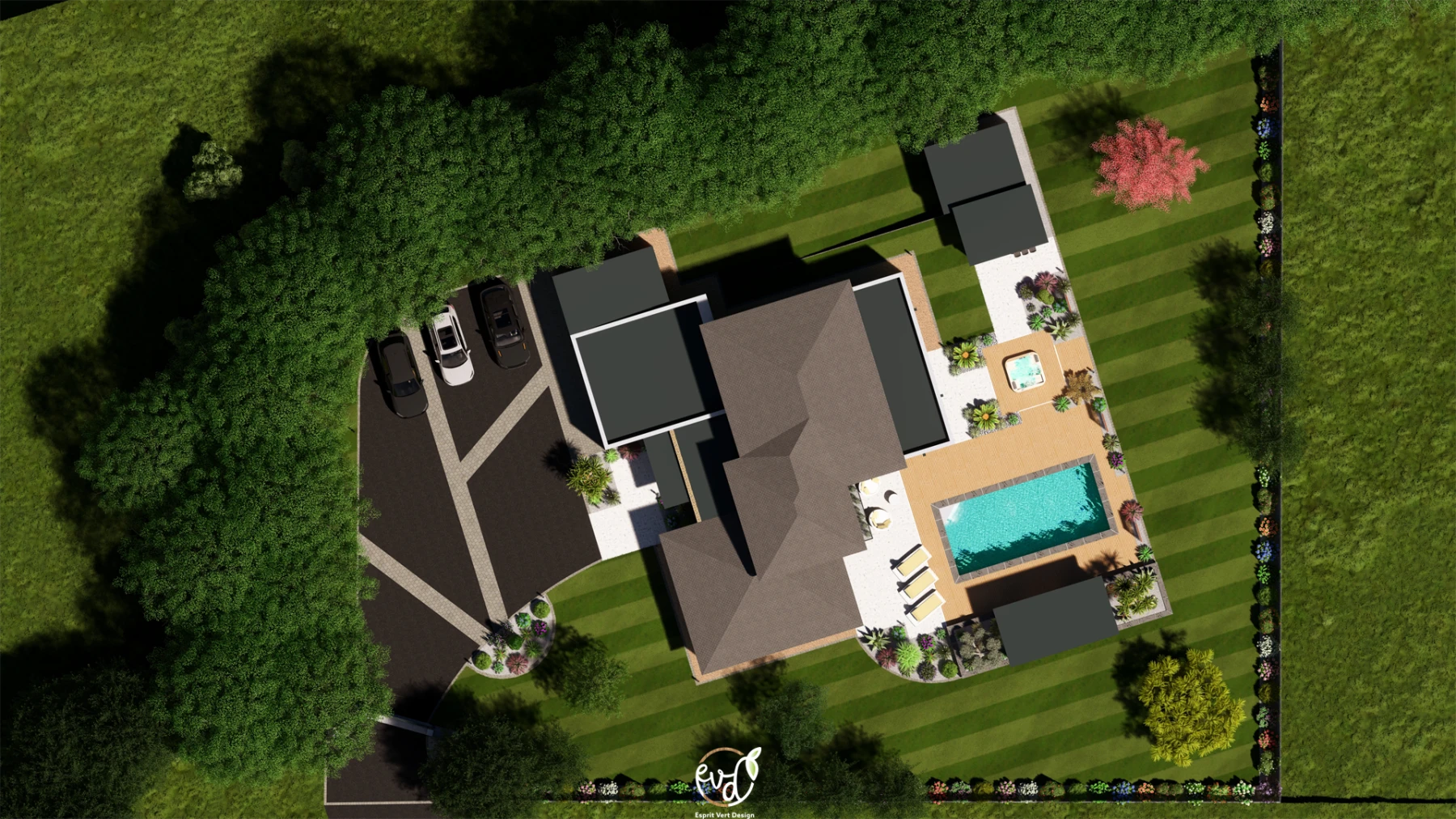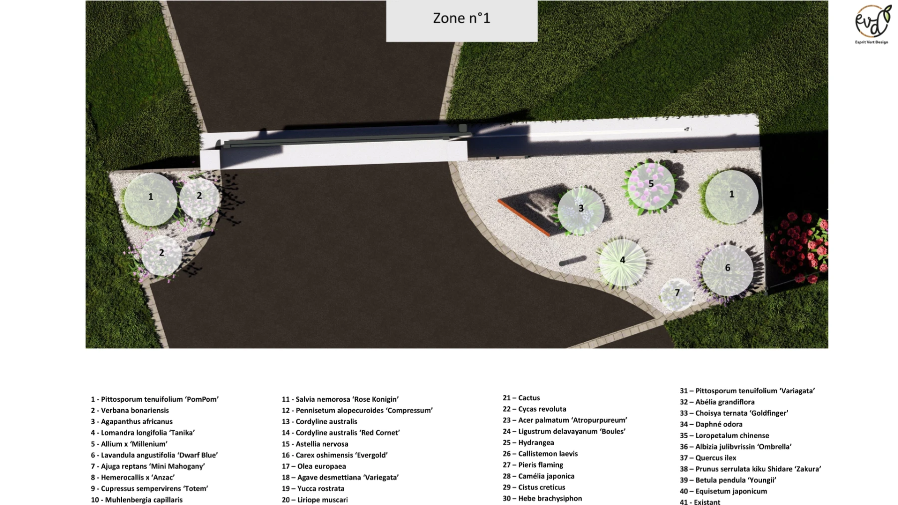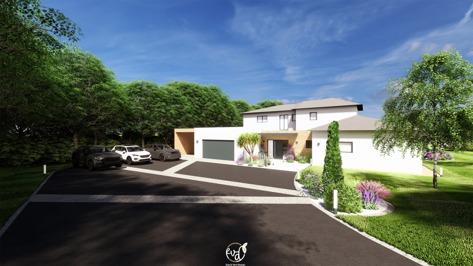 - Parking en enrobé avec des bandes de pavage pour casser la masse, apportant un côté structuré et harmonieux à l'entrée.