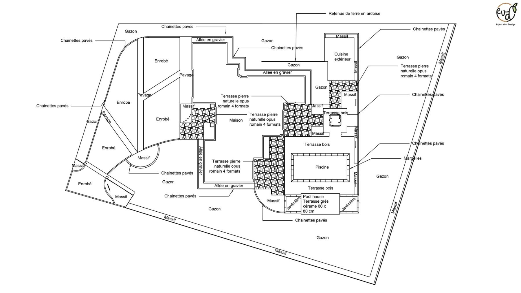 - L'entrée en pierre opus 4 formats, sublimée par des végétaux, guide de manière élégante les visiteurs vers la maison, créant une atmosphère accueillante dès l'arrivée.