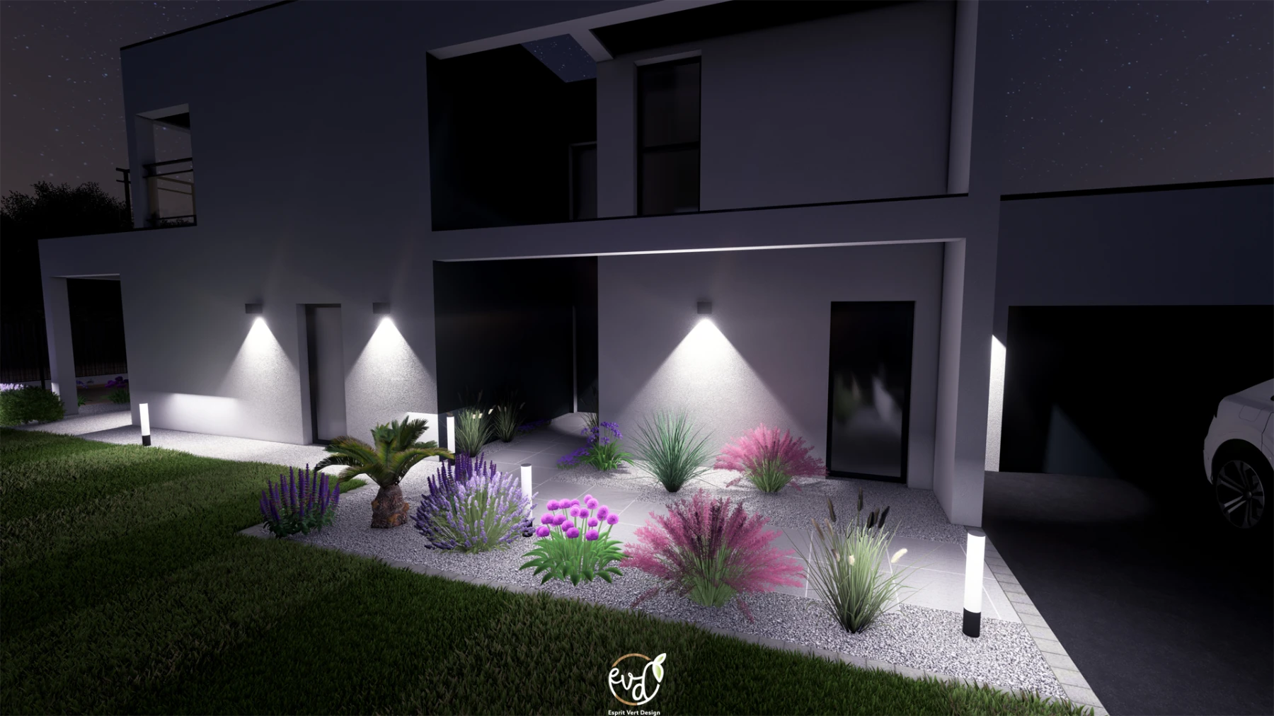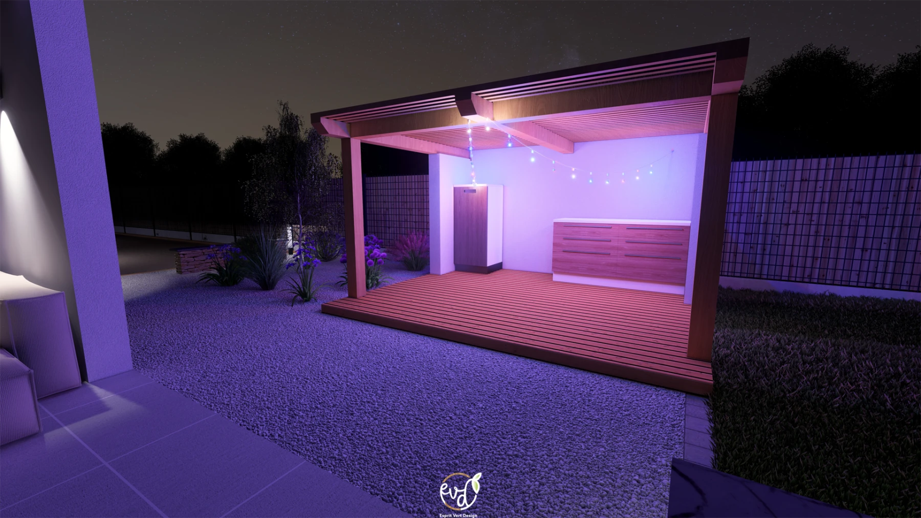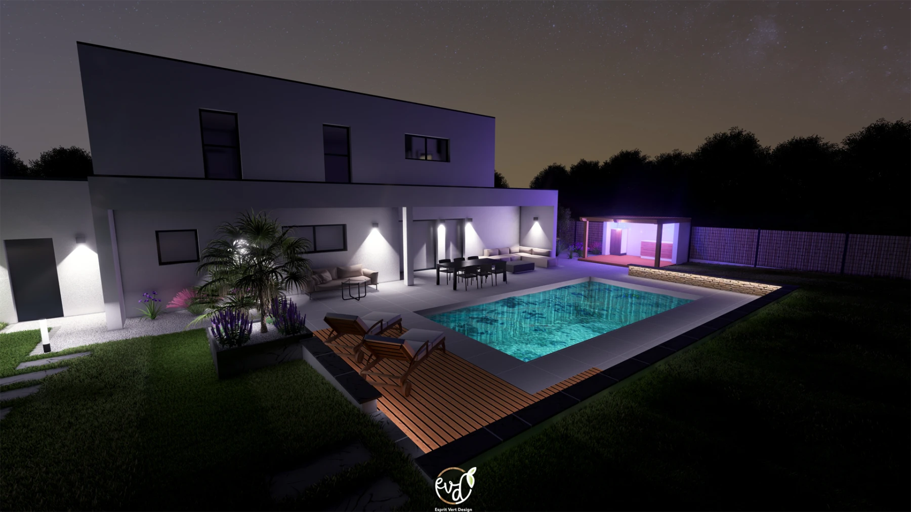 Un éclairage discret a été installé sur tout l'aménagement pour prolonger les soirées d'été, mettant en valeur les différents espaces tout en assurant une ambiance agréable.