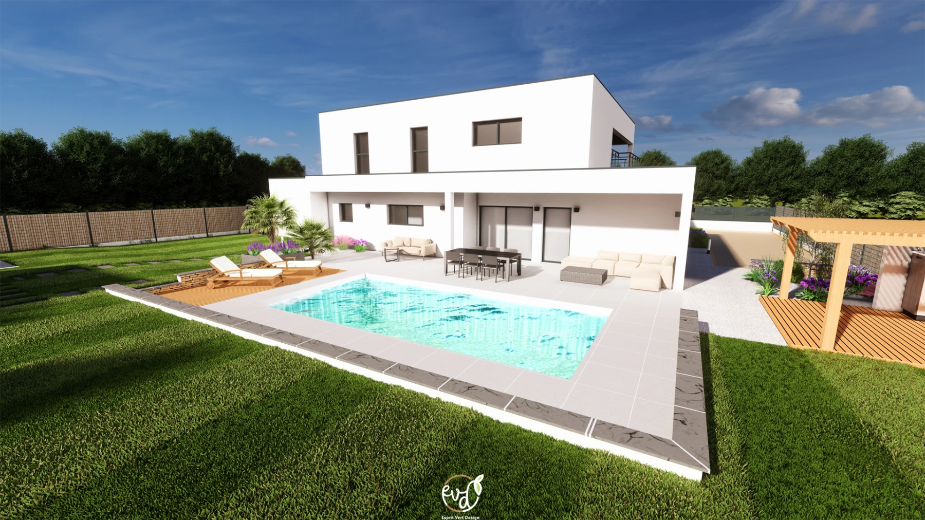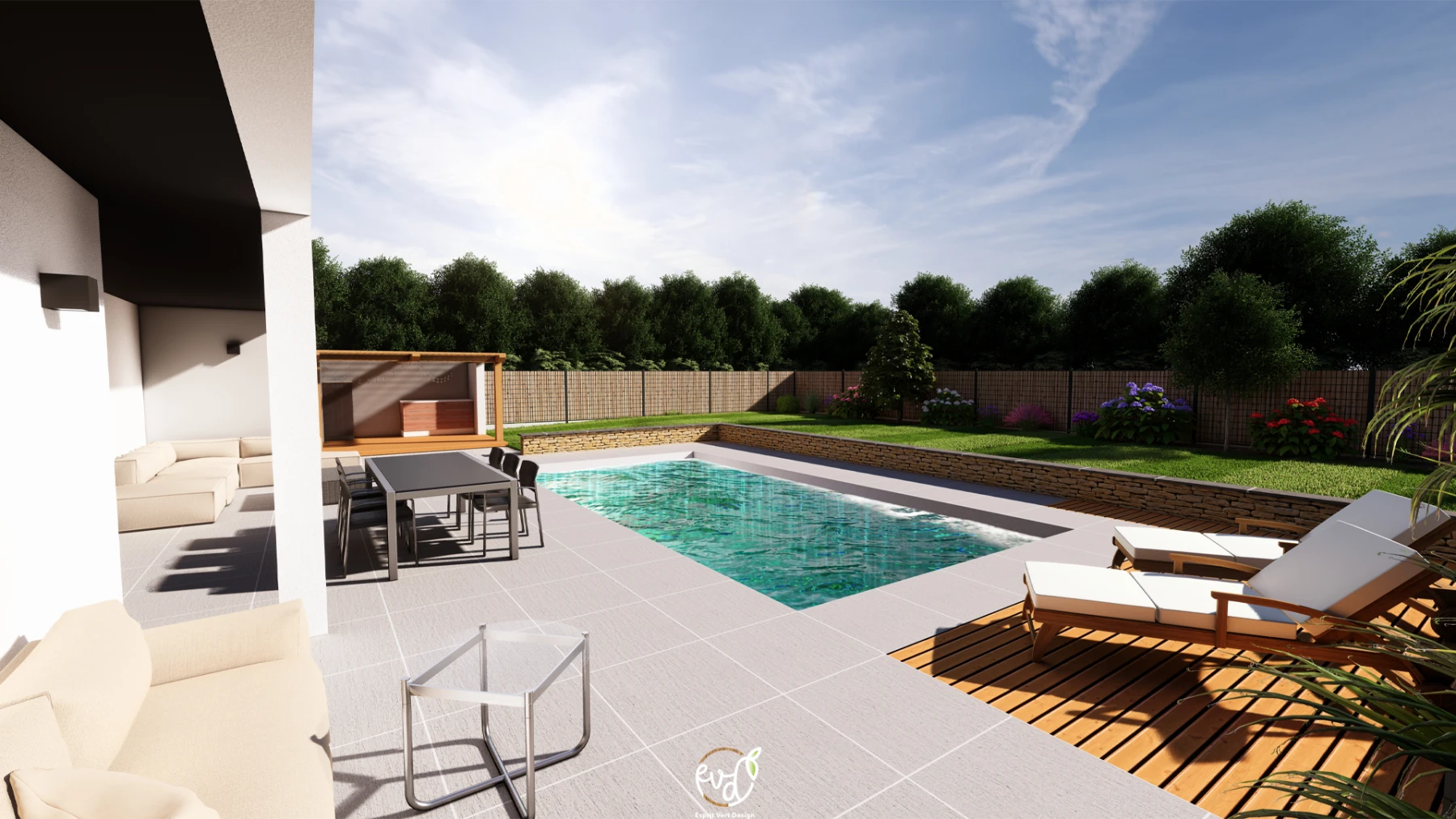 - Piscine sur le côté Sud du jardin, entourée d’un pourtour en dalles de grès cérame, pour un aspect moderne et épuré.