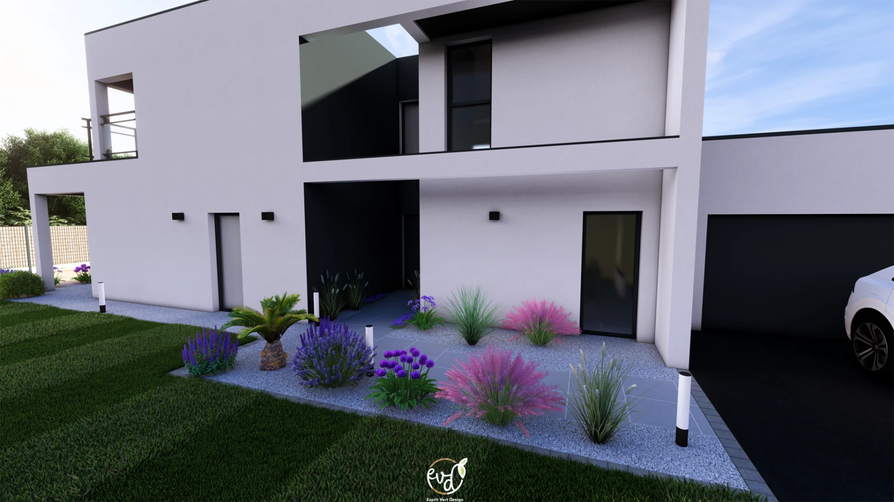 - Entrée de l'habitation : un dallage en dalles de grès cérame qui mène à la porte d’entrée, agrémenté de végétaux de part et d’autre pour ajouter de la verdure et de la fraîcheur à l’accueil.