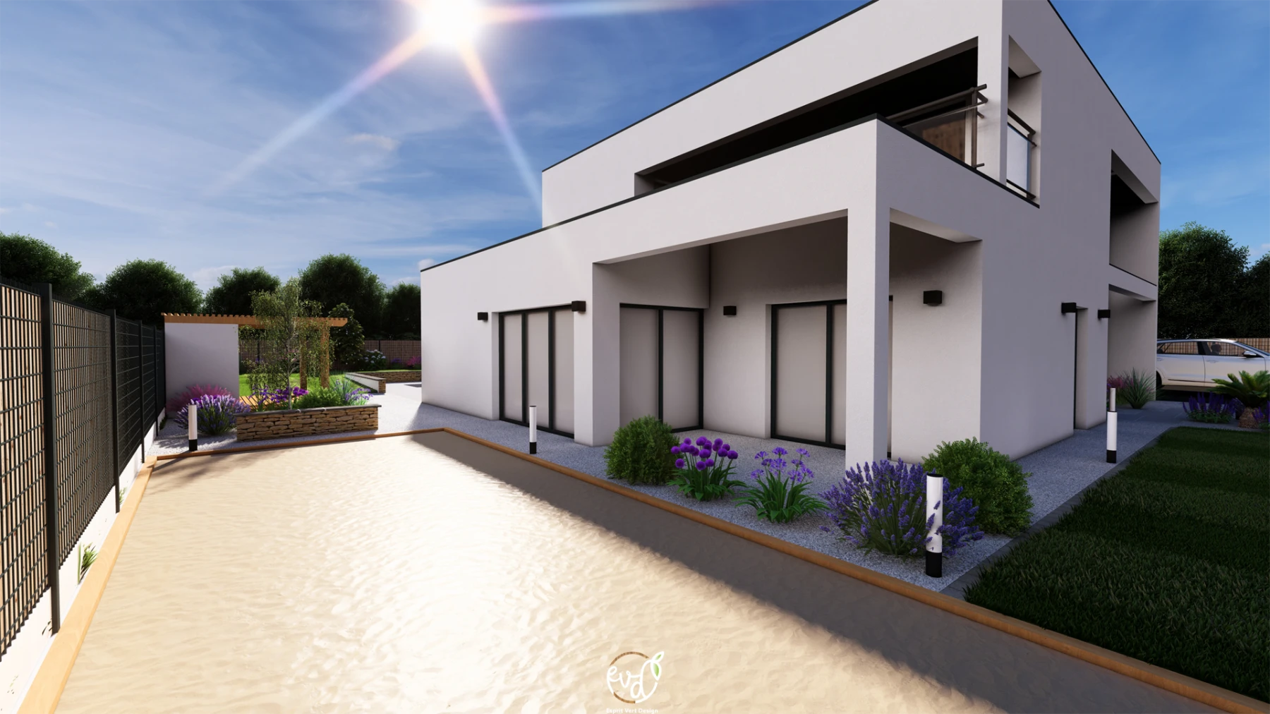 - Terrain de pétanque aménagé sur le côté, agrémenté de végétalisation pour un aspect naturel et agréable tout en étant un véritable espace de loisirs.
