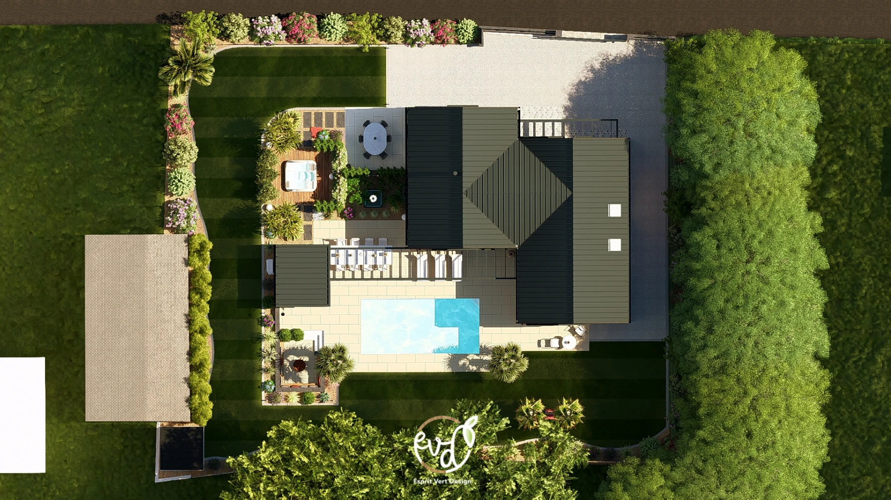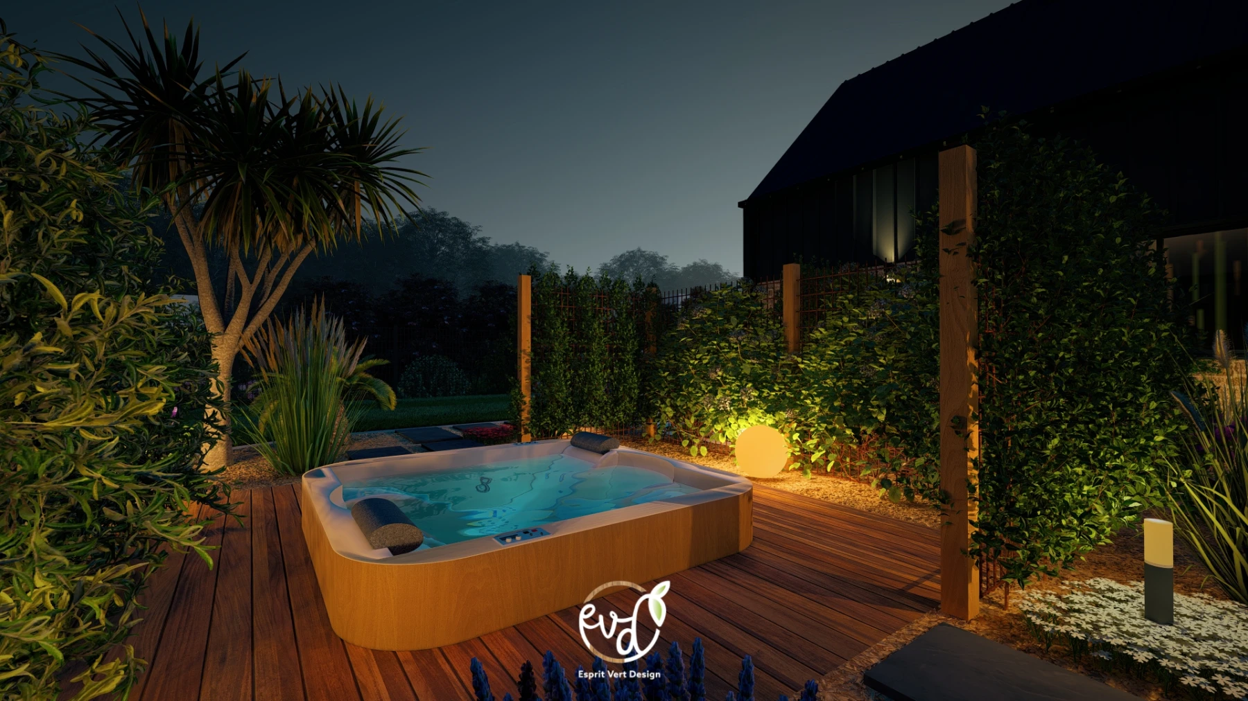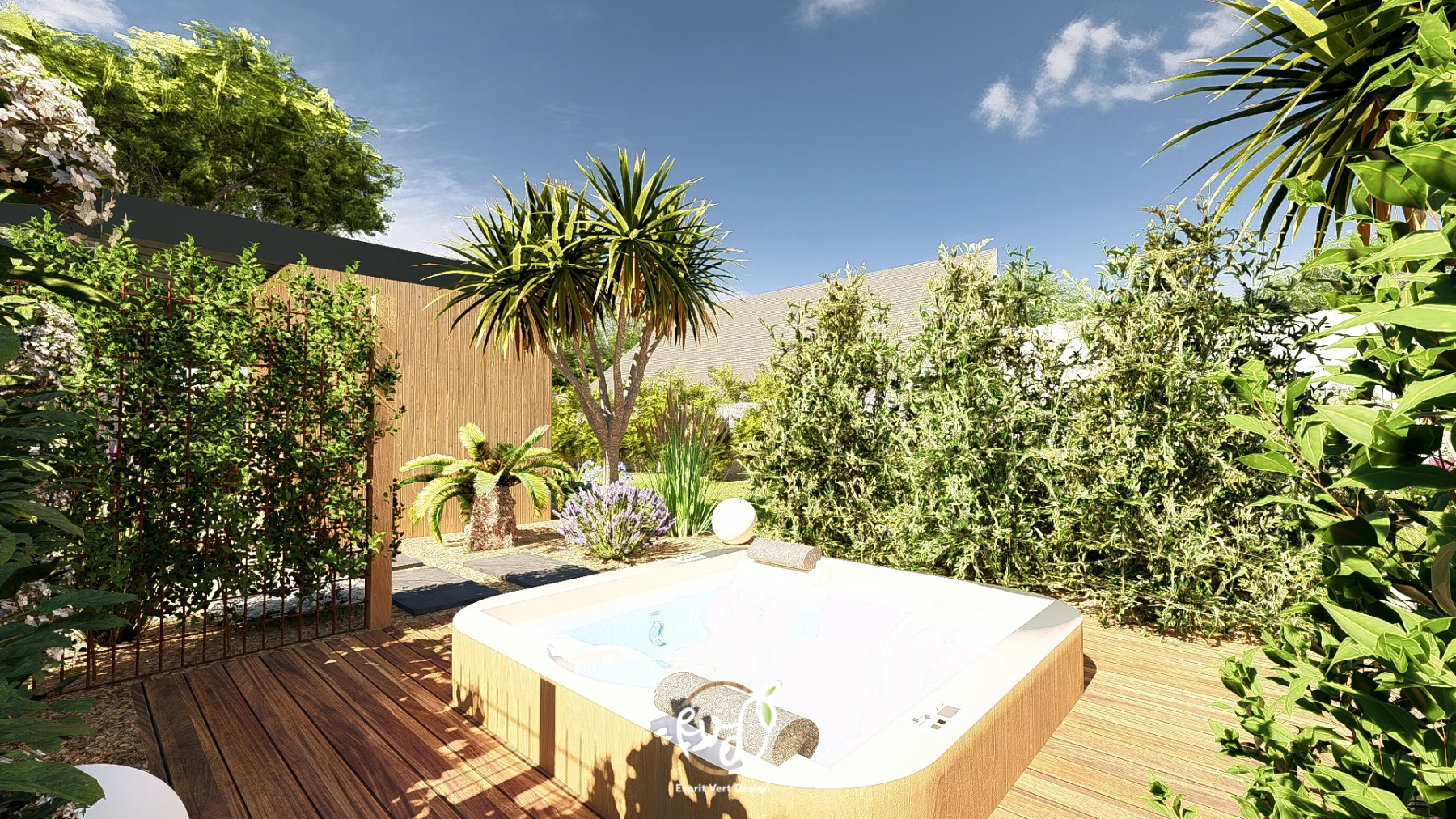 Un espace locatif a été imaginé avec une petite terrasse en grès cérame, parfaite pour un moment de détente ou un repas en extérieur. Un coin spa, dissimulé par une végétation luxuriante, garantit intimité et relaxation.