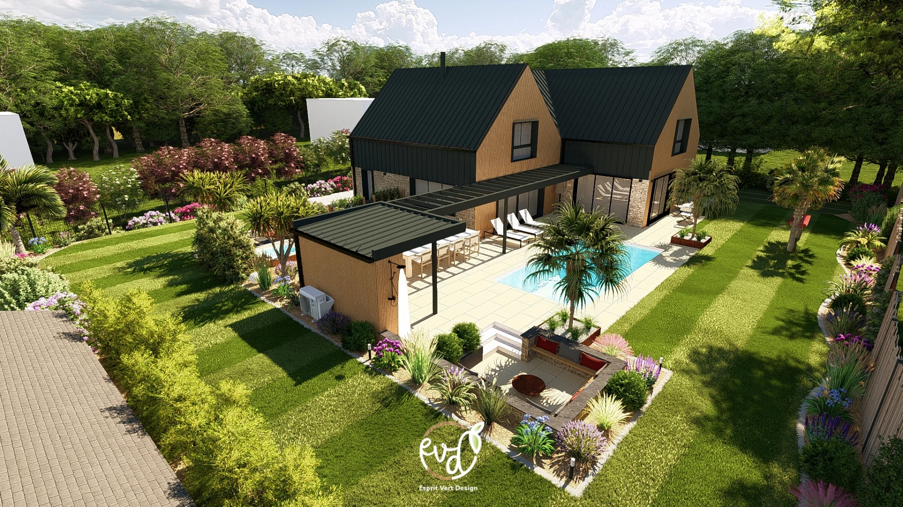 Pour profiter des soirées conviviales, un coin brasero encastré a été créé. Il est mis en valeur par un muret en pierre, ajoutant une touche chaleureuse et naturelle à l’ensemble.